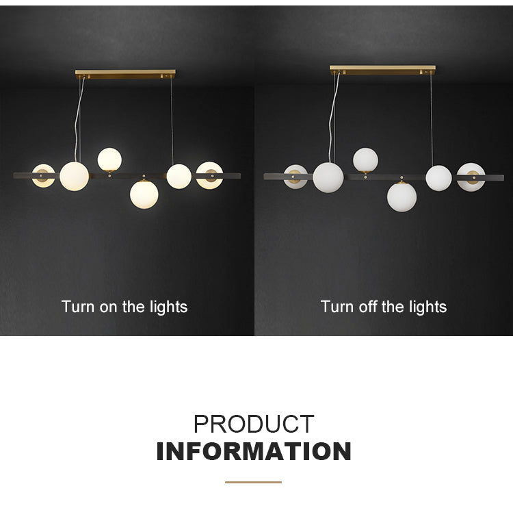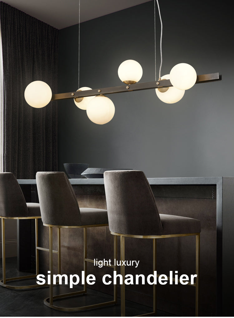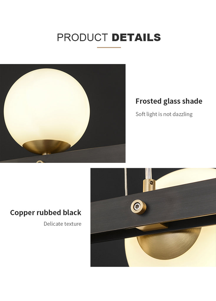 This long fashion 6-ball copper chandelier is composed of brass and glass. Its unique design sense can bring a strong visual impact to your space. The combination of copper and black makes the lamp body more advanced and has a stronger service life. It will be a good decoration to put it in your living room.